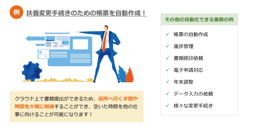 フォーマットやパターンを選択するだけで書類やリストを自動作成でき、さらに電子申請までワンストップで行うことが可能になります。